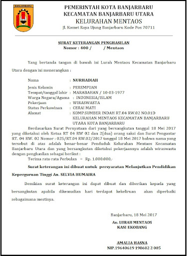 Sesuai dengan sumpah/janji jabatan saya sebagai (bendahara gaji/kepala bagian . Seumpama ada keperluan untuk pendaftaran anak, yang syaratnya adalah slip gaji orang tua maka surat keterangan penghasilan bisa menjadi . Berikut ini akan diulas contoh slip gaji, surat keterangan gaji, . Pastikan anda memiliki surat keterangan penghasilan kerja atau slip gaji untuk mempermudah administrasi. Dengan menyatakan bahwa saat ini, saya selaku orangtua yang berpenghasilan sekitar.